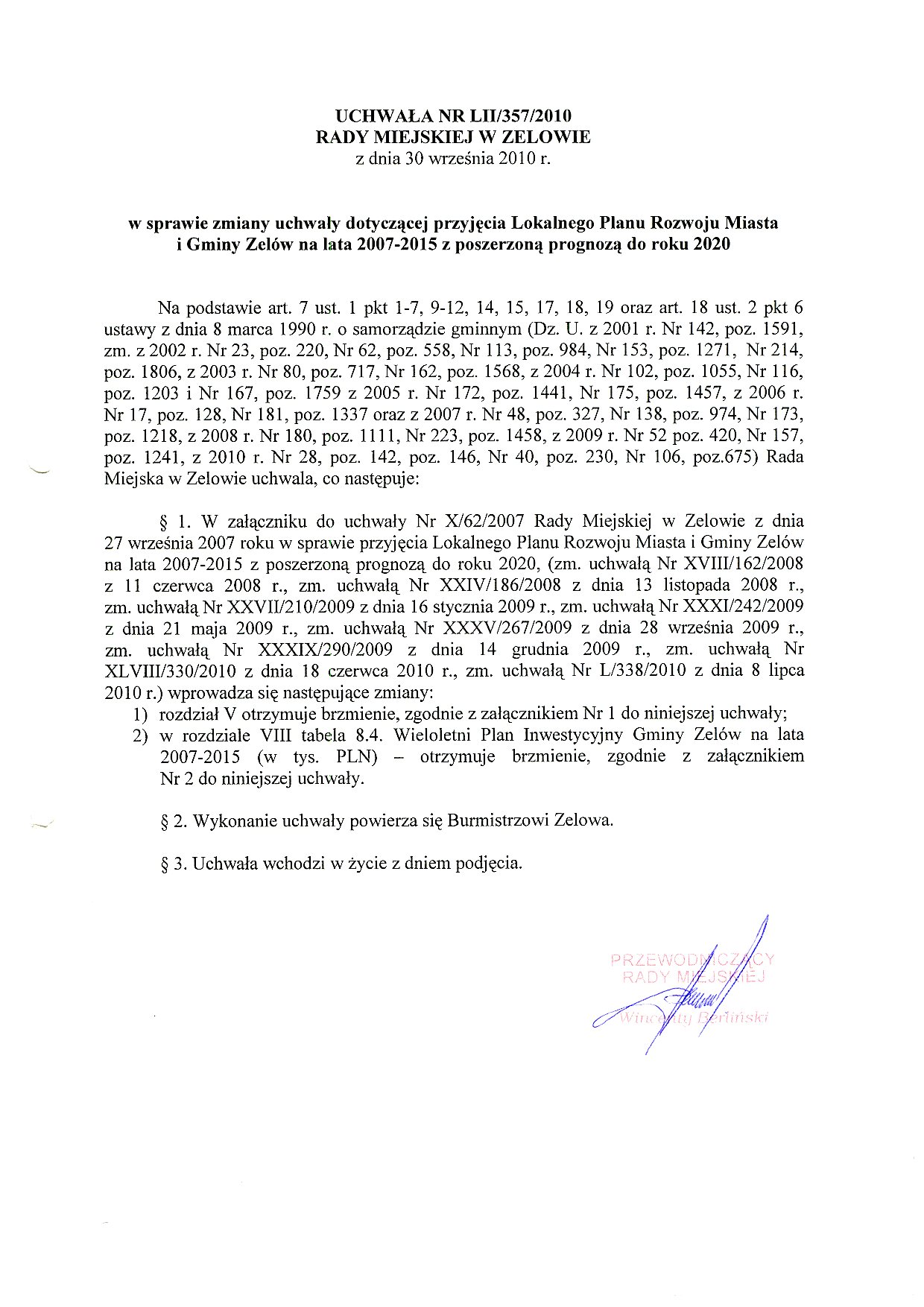 | Tytuł aktu prawnego - skrócony: | Uchwała w sprawie zmiany uchwały dotyczącej przyjęcia Lokalnego Planu Rozwoju Miasta i Gminy Zelów na lata 2001-2015 z poszerzoną prognozą do roku 2020. |