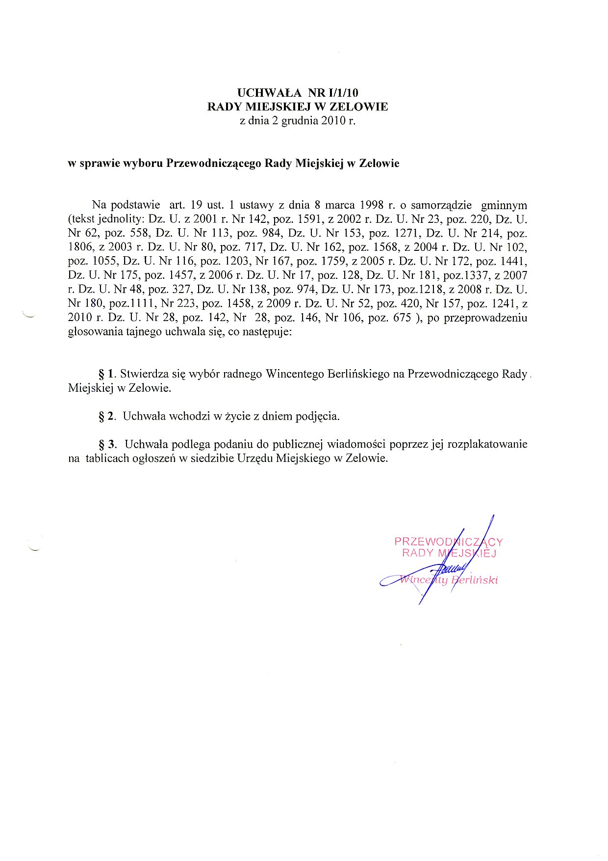 | Tytuł aktu prawnego - skrócony: | Uchwała w sprawie wyboru Przewodniczącego Rady Miejskiej w Zelowie |