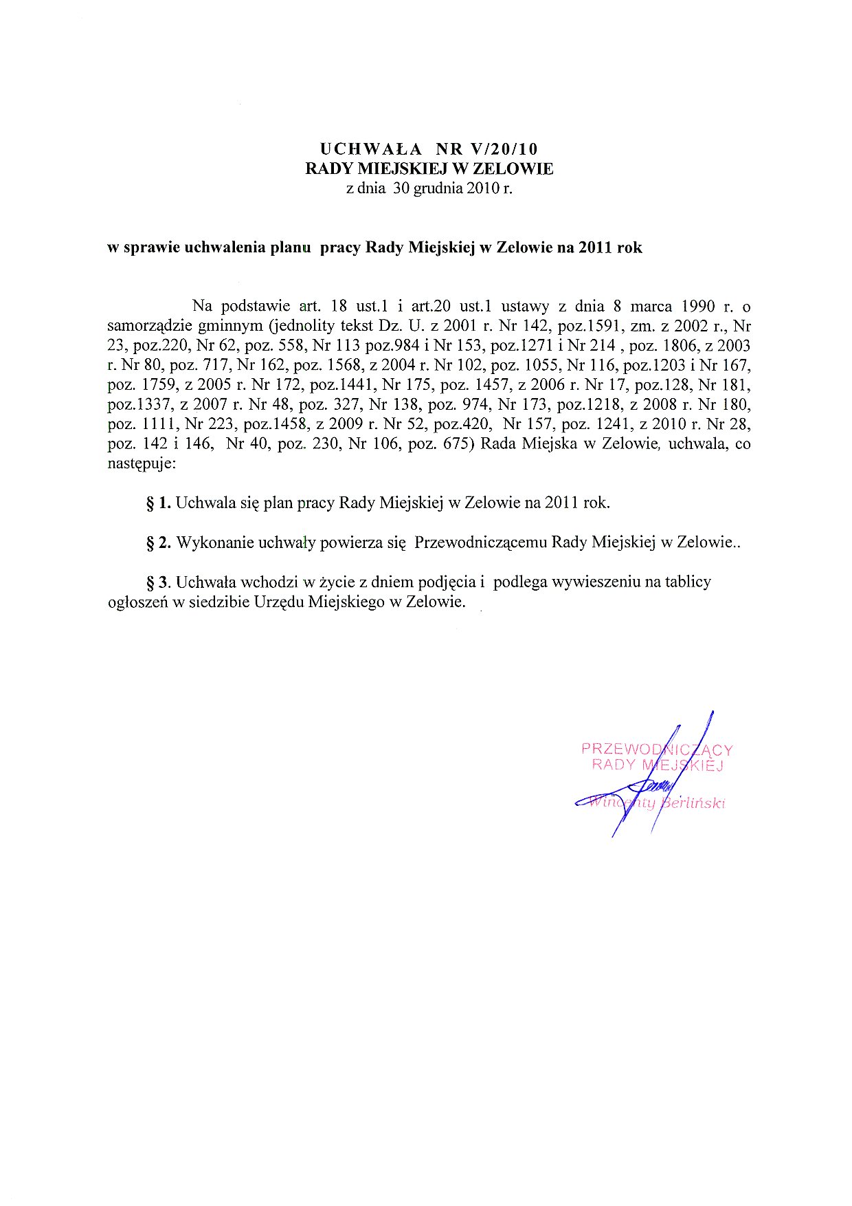 | Tytuł aktu prawnego - skrócony: | Uchwała w sprawie uchwalenia planu pracy Rady Miejskiej w Zelowie na 2011 rok |