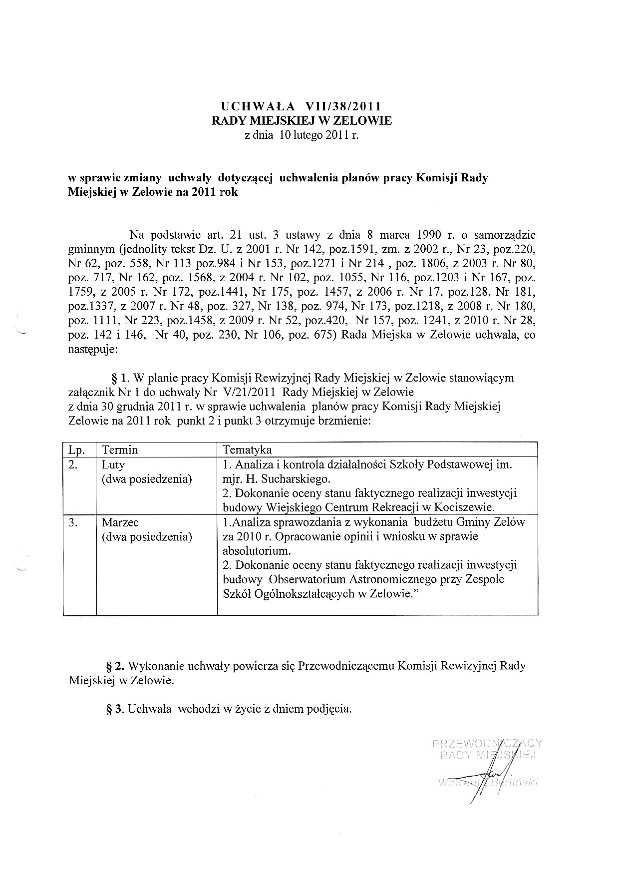 | Tytuł aktu prawnego - skrócony: | w sprawie zmiany uchwały dotyczącej uchwalenia planów pracy Komisji Rady Miejskeij w Zelowie na 2011 rok |