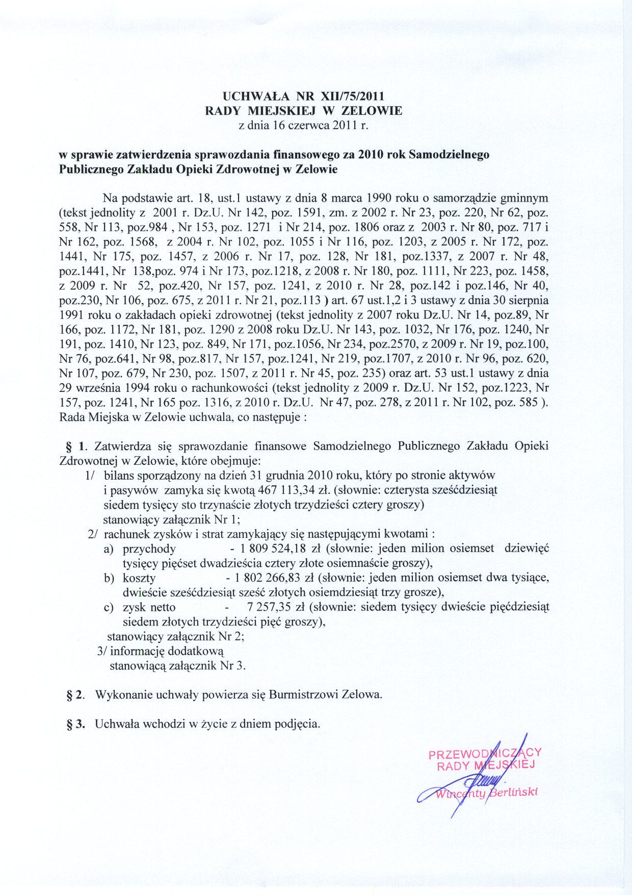 | Tytuł aktu prawnego - skrócony: | w sprawie zatwierdzenia. sprawozdania finansowego za 2010 rok Samodzielnego Publicznego Zakładu Opieki Zdrowotnej w Zelowie. |