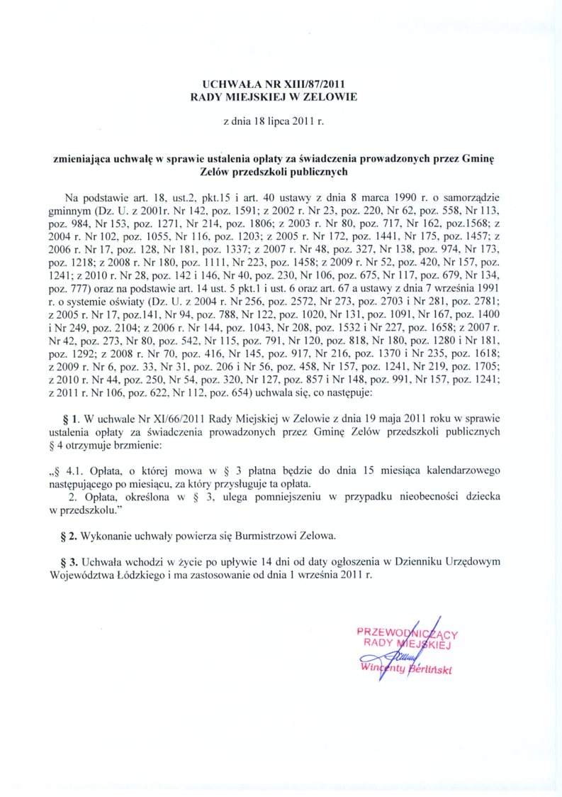 | Tytuł aktu prawnego - skrócony: | zmieniająca uchwałę w sprawie ustalenia opłaty za świadczenia prowadzonych przez Gminę Zelów przedszkoli publicznych |