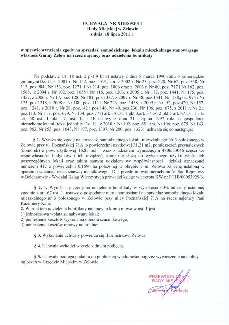 | Tytuł aktu prawnego - skrócony: | w sprawie wyrażenia zgody na sprzedaż samodzielnego lokalu mieszkalnego stanowiącego własność Gminy Zelów na rzecz najemcy oraz udzielenia bonifikaty |
