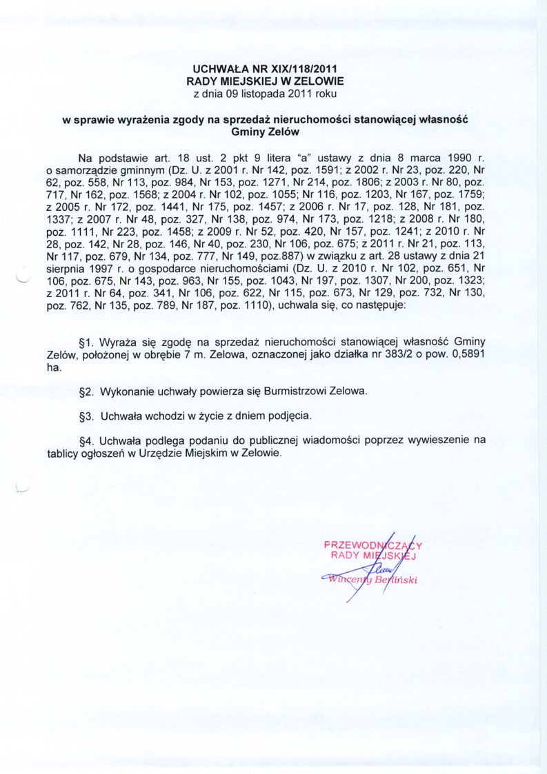 | Tytuł aktu prawnego - skrócony: | w sprawie wyrażenia zgody na sprzedaż nieruchomości stanowiącej własność Gminy Zelów. |