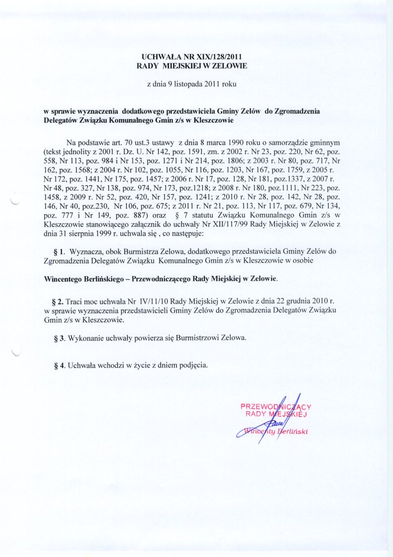 | Tytuł aktu prawnego - skrócony: | w sprawie wyznaczenia dodatkowego przedstawiciela Gminy Zelów do Zgromadzenia Delegatów Związku Komunalnego Gmin z/s w Kleszczowie. |