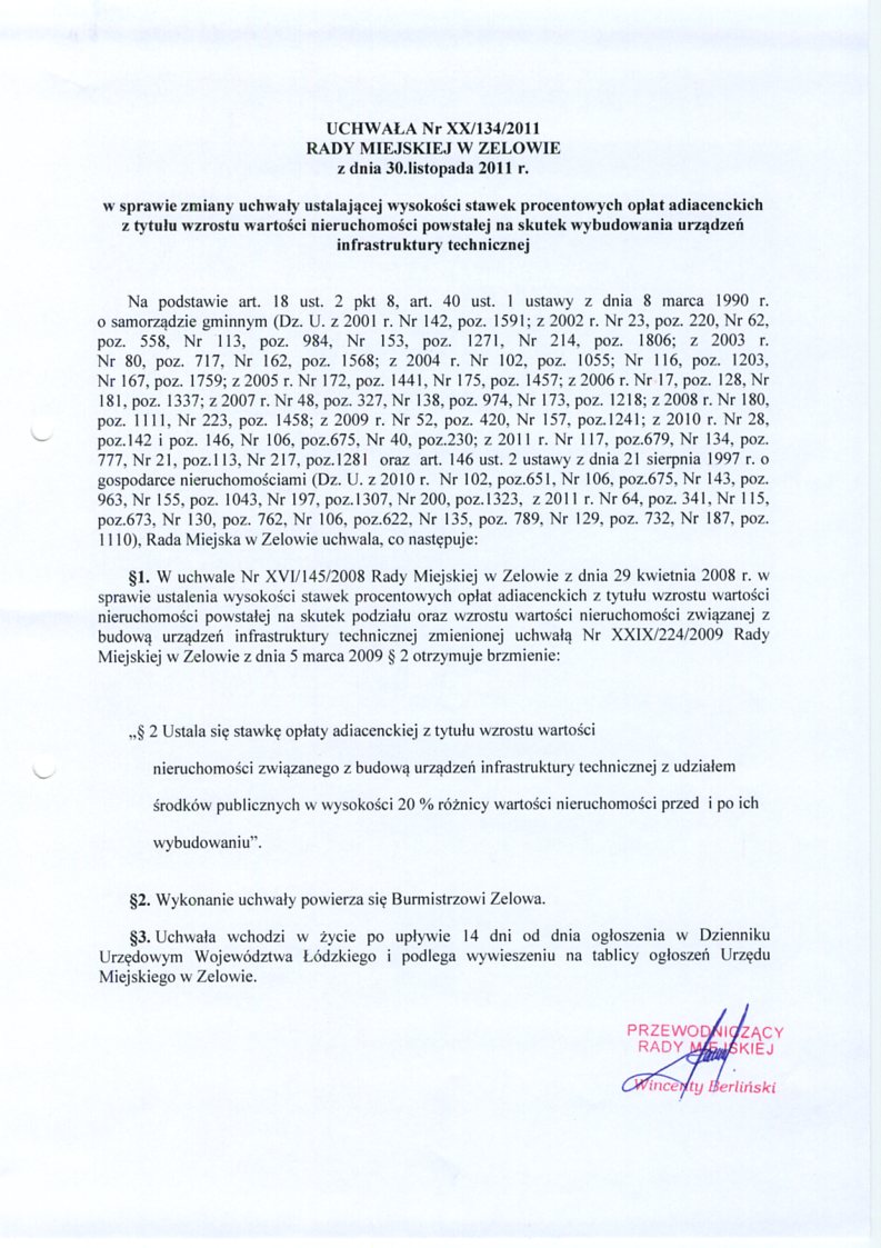 | Tytuł aktu prawnego - skrócony: | w sprawie zmiany uchwały ustalającej wysokości stawek procentowych opłat adiacenckich z tytułu wzrostu wartości nieruchomości powstałej na skutek wybudowania urządzeń ingfrastruktury technicznej |