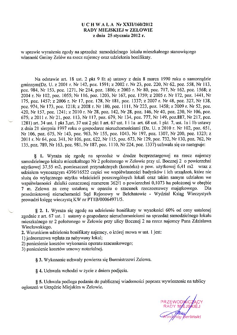 | Tytuł aktu prawnego - skrócony: | w sprawie wyrażenia zgody na sprzedaż samodzielnego lokalu mieszkalnego stanowiącego własność Gminy Zelów na rzecz najemcy oraz udzielenia bonifikaty. |