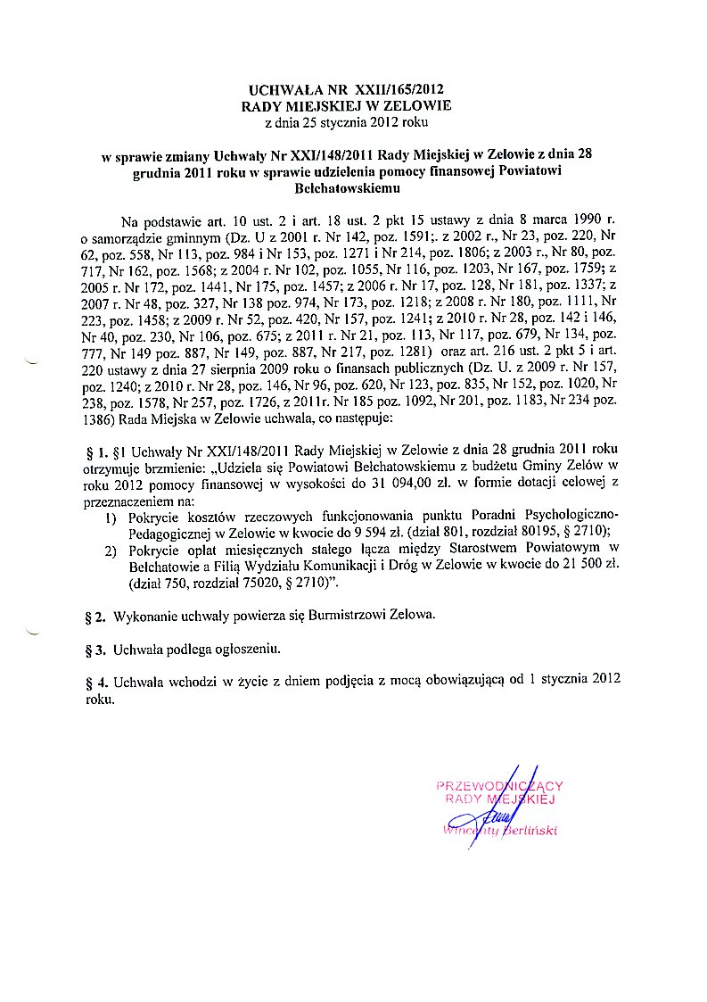 | Tytuł aktu prawnego - skrócony: | w sprawie zmiany Uchwały Nr XXI/148/2011 Rady Miejskiej w Zelowie z 28 grudnia 2011 roku w sprawie udzielenia pomocy finansowej Powiatowi Bełchatowskiemu. |