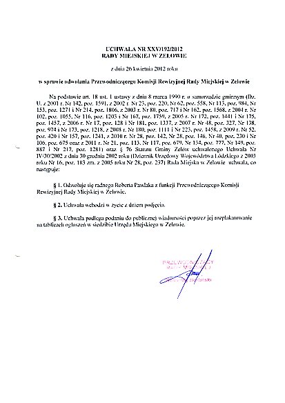 | Tytuł aktu prawnego - skrócony: | w sprawie odwołania Przewodniczącego Komisji Rewizyjnej Rady Miejskiej w Zelowie |