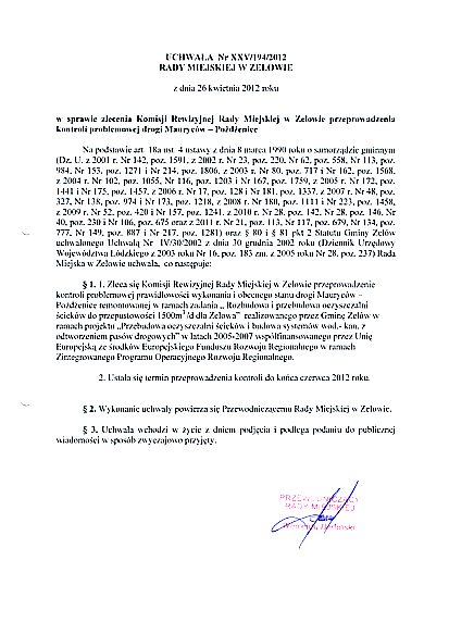 | Tytuł aktu prawnego - skrócony: | w sprawie zlecenia Komisji Rewizyjnej Rady Miejskiej w Zelowie przeprowadzenia kontroli problemowej drogi Mauryców - Pożdżenice |
