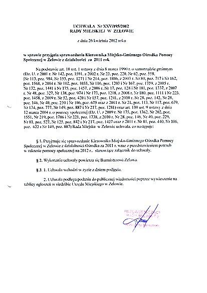 | Tytuł aktu prawnego - skrócony: | w sprawie przyjęcia sprawozdania Kierownika Miejsko-Gminnego Ośrodka Pomocy Społecznej w Zelowie z działalności za 2011 rok. |
