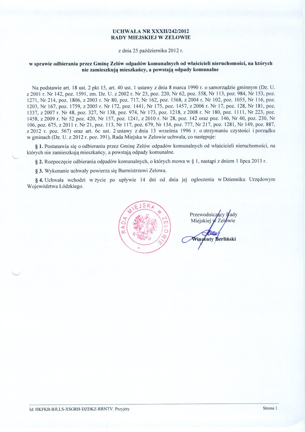 | Tytuł aktu prawnego - skrócony: | w sprawie odbierania przez Gminę Zelów odpadów komunalnych od właścicieli nieruchomości, na których nie zamieszkują mieszkańcy, |