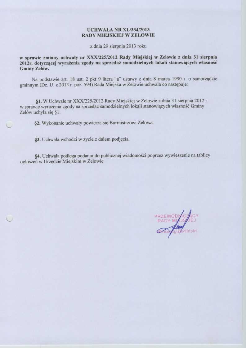 | Tytuł aktu prawnego - skrócony: | w sprawie zmiany uchwały nr XXX/225/2012 Rady Miejskiej w Zelowie z dnia 31 sierpnia 2012 r. dotyczącej wyrażenia zgody na sprzedaż samodzielnych lokali stanowiących własność Gminy Zelów. |