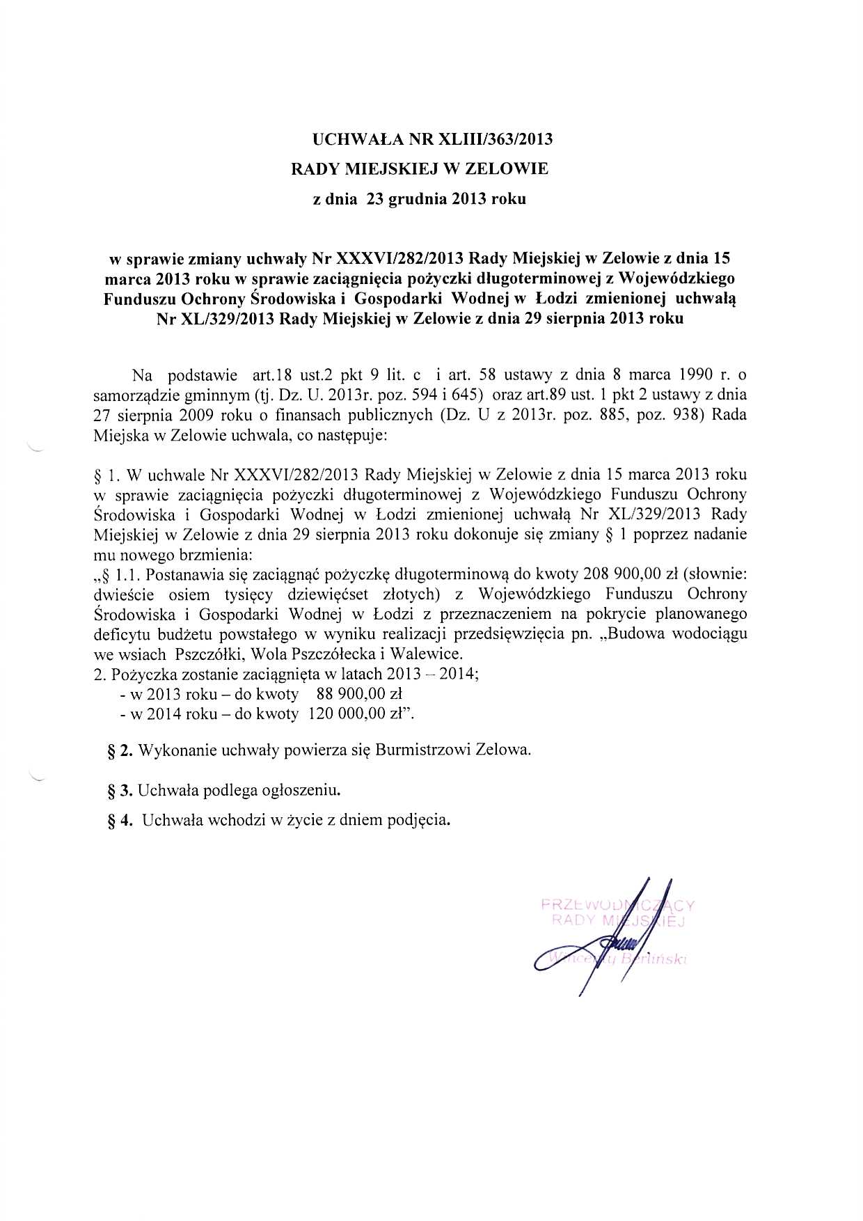 | Tytuł aktu prawnego - skrócony: | w sprawie zmiany uchwały Nr XXXVI/282/2013 Rady Miejskiej w Zelowie z dnia 15 marca 2013 roku w sprawie zaciągnięcia pożyczki długoterminowej z Wojewódzkiego Funduszu Ochrony Środowiska i Gospodarki Wodnej w Łodzi zmienionej uchwałą Nr XL/329/2013 Rady Miejskiej w Zelowie z dnia 29 sierpnia 2013 roku. |