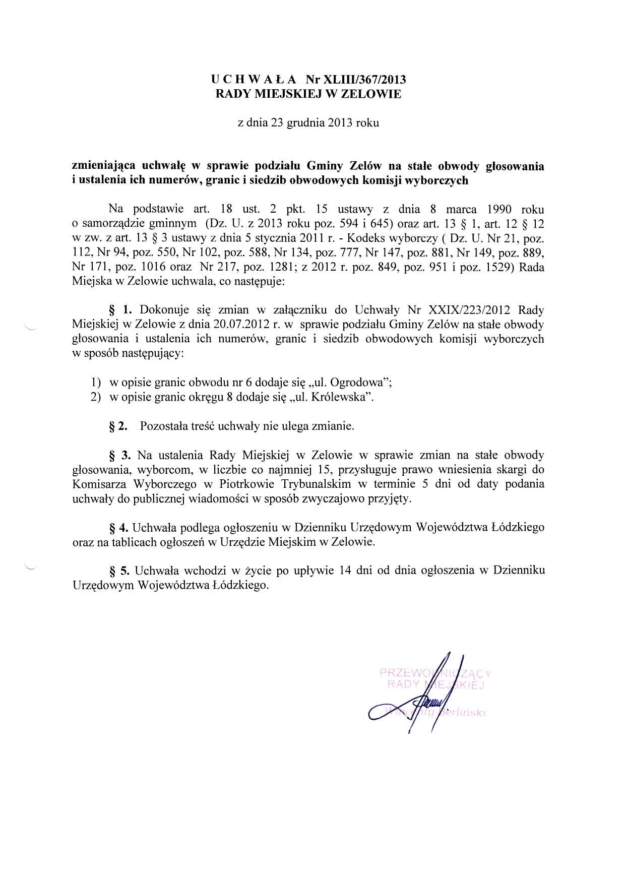 | Tytuł aktu prawnego - skrócony: | zmieniająca uchwałę w sprawie podziału Gminy Zelów na stałe obwody głosowania i ustalenia ich numerów, granic i siedzib obwodowych komisji wyborczych. |