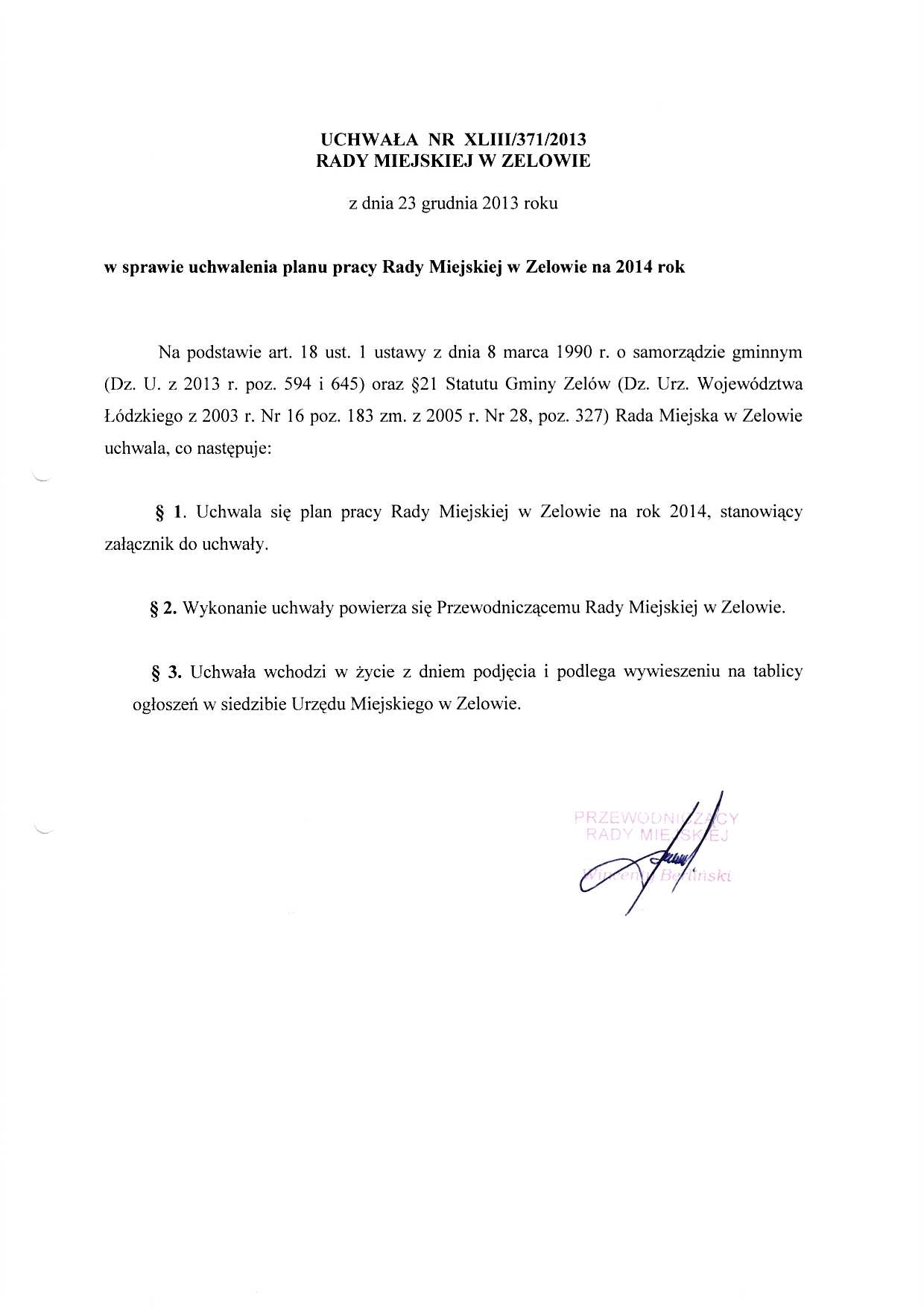 | Tytuł aktu prawnego - skrócony: | w sprawie uchwalenia planu pracy Rady Miejskiej w Zelowie na 2014 rok. |