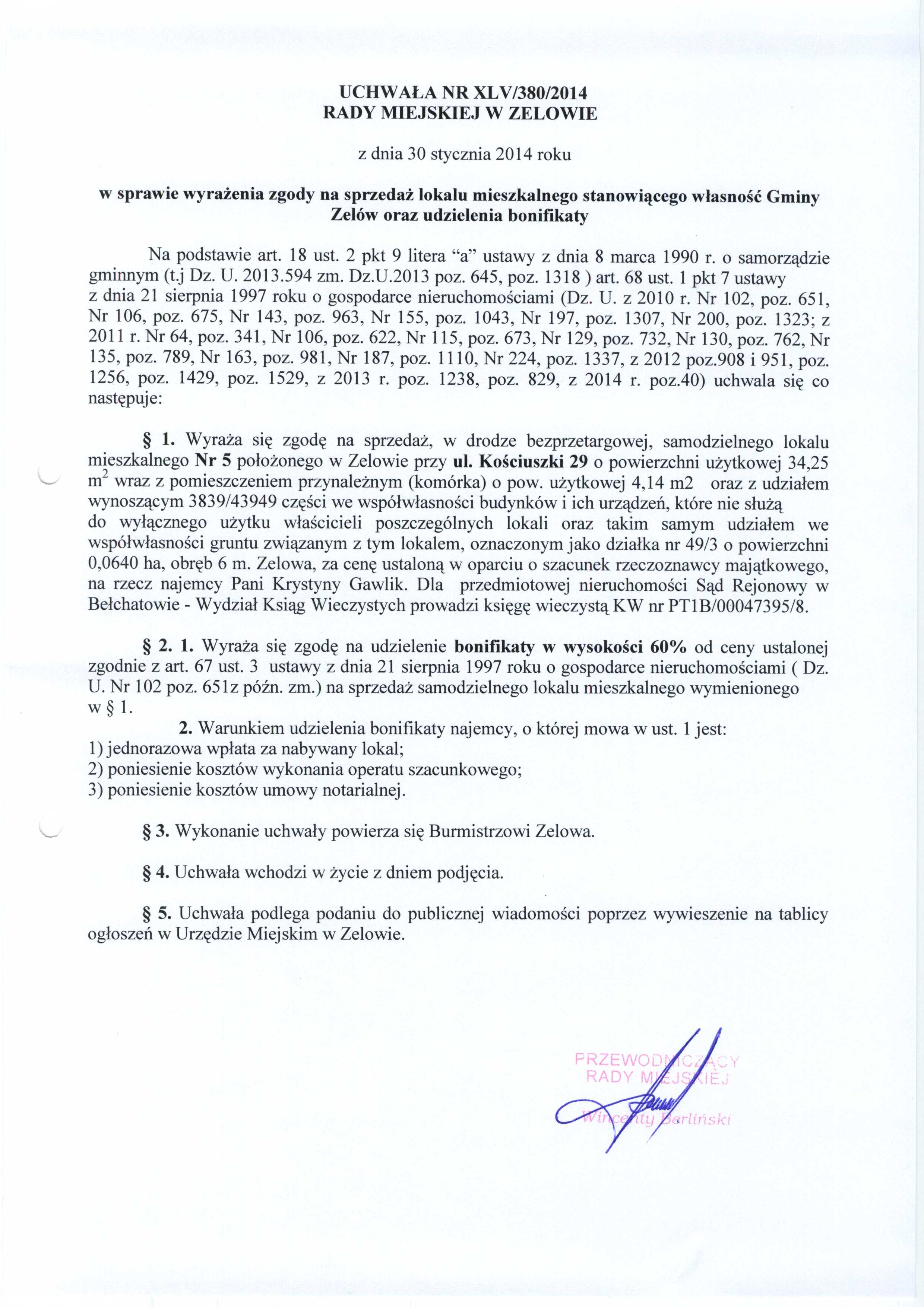 | Tytuł aktu prawnego - skrócony: | w sprawie wyrażenia zgody na sprzedaż lokalu mieszkalnego stanowiącego własność Gminy Zelów oraz udzielania bonifikaty. |