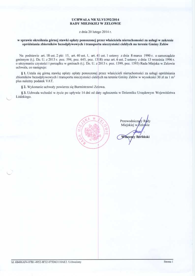 | Tytuł aktu prawnego - skrócony: | w sprawie określenia górnej stawki opłaty ponoszonej przez właściciela nieruchomości za usługi w zakresie opróżniania zbiorników bezodpływowych i transportu nieczystości ciekłych na terenie Gminy Zelów. |
