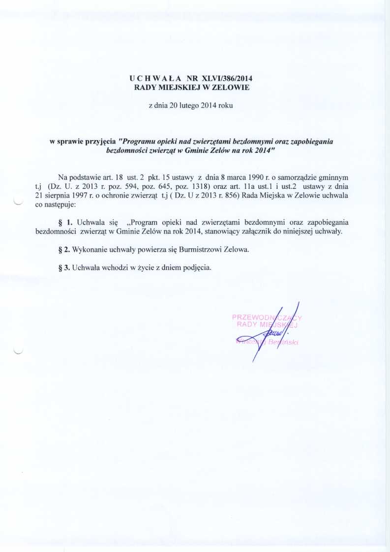 | Tytuł aktu prawnego - skrócony: | w sprawie przyjęcia ĄProgramu opieki nad zwierzętami bezdomnymi oraz zapobiegania bezdomności zwierząt w Gminie Zelów na rok 2014Ó. |
