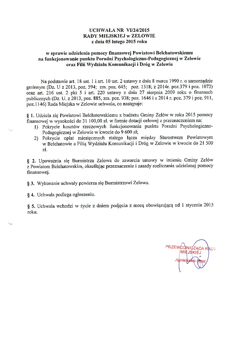 | Tytuł aktu prawnego - skrócony: | w sprawie udzielenia pomocy finansowej Powiatowi Bełchatowskiemu na funkcjonowanie punktu Poradni Psychologiczno-Pedagogicznej w Zelowie oraz Filii Wydziału Komunikacji i Dróg w Zelowie |