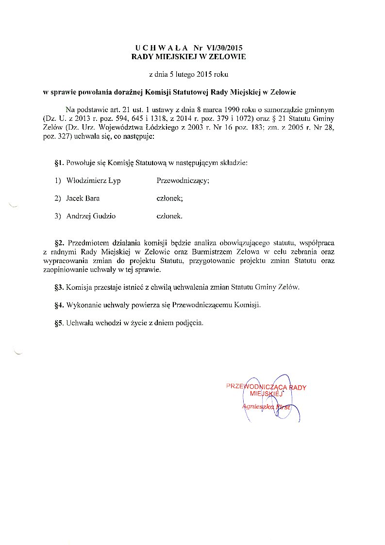 | Tytuł aktu prawnego - skrócony: | w sprawie powołania doraźnej Komisji Statutowej Rady Miejskiej w Zelowie. |