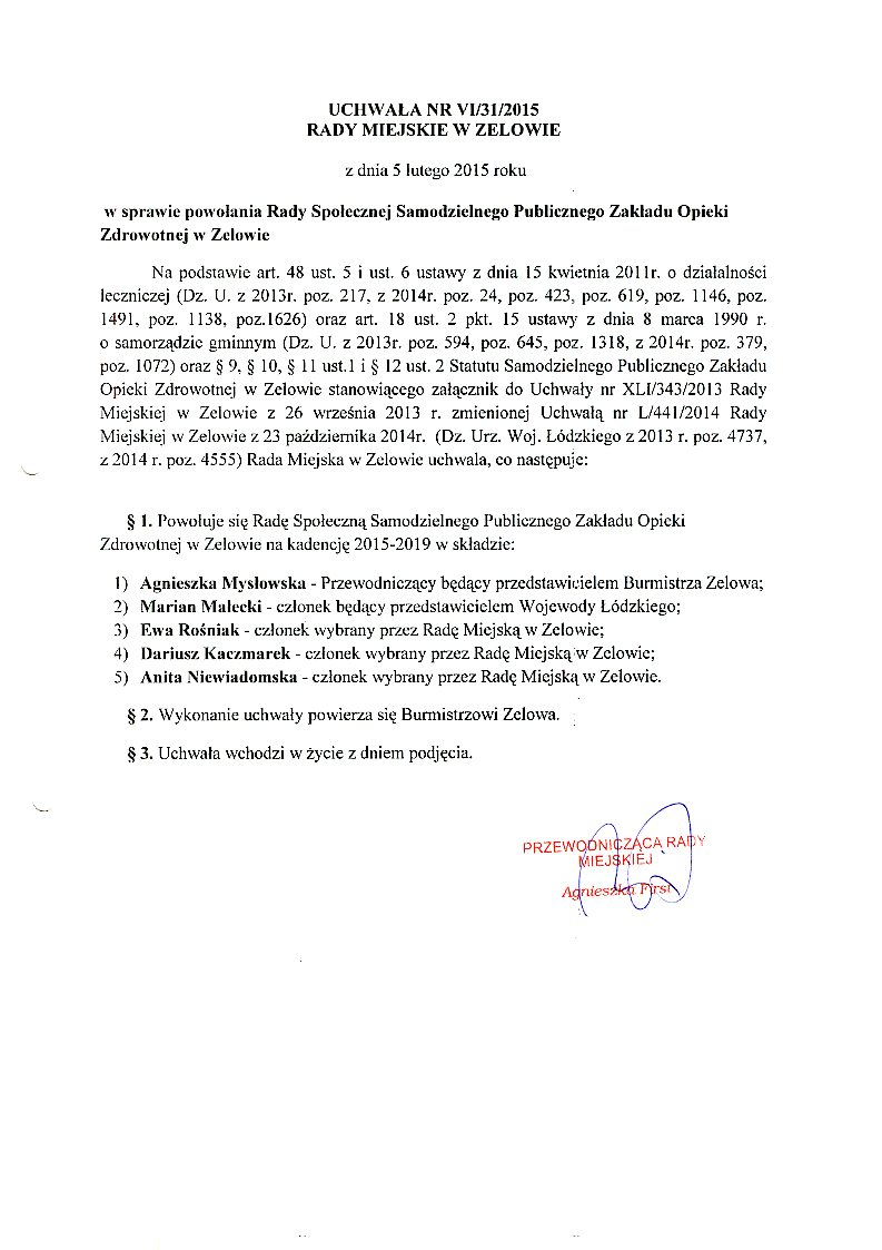 | Tytuł aktu prawnego - skrócony: | w sprawie powołania Rady Społecznej Samodzielnego Publicznego Zakładu Opieki Zdrowotnej w Zelowie. |