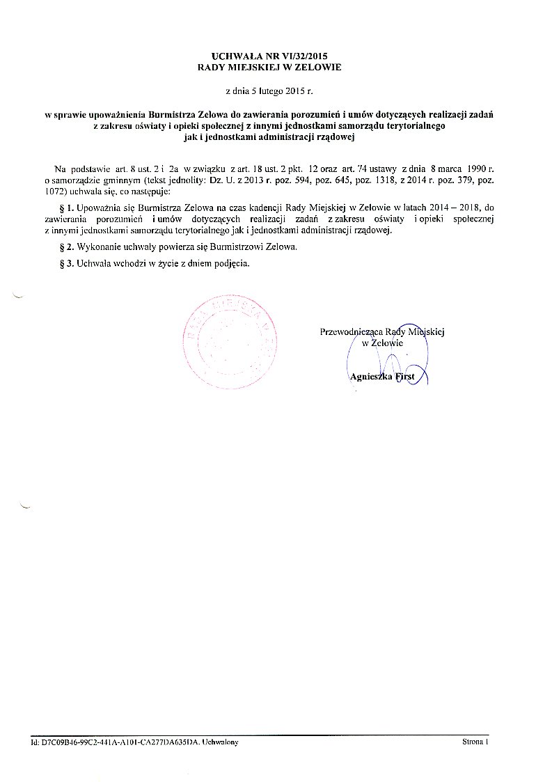 | Tytuł aktu prawnego - skrócony: | w sprawie upoważnienia Burmistrza Zelowa do zawierania porozumień i umów dotyczących realizacji zadań z zakresu oświaty i opieki społecznej z innymi jednostkami samorządu terytorialnego, jak i jednostkami administracji rządowej. |