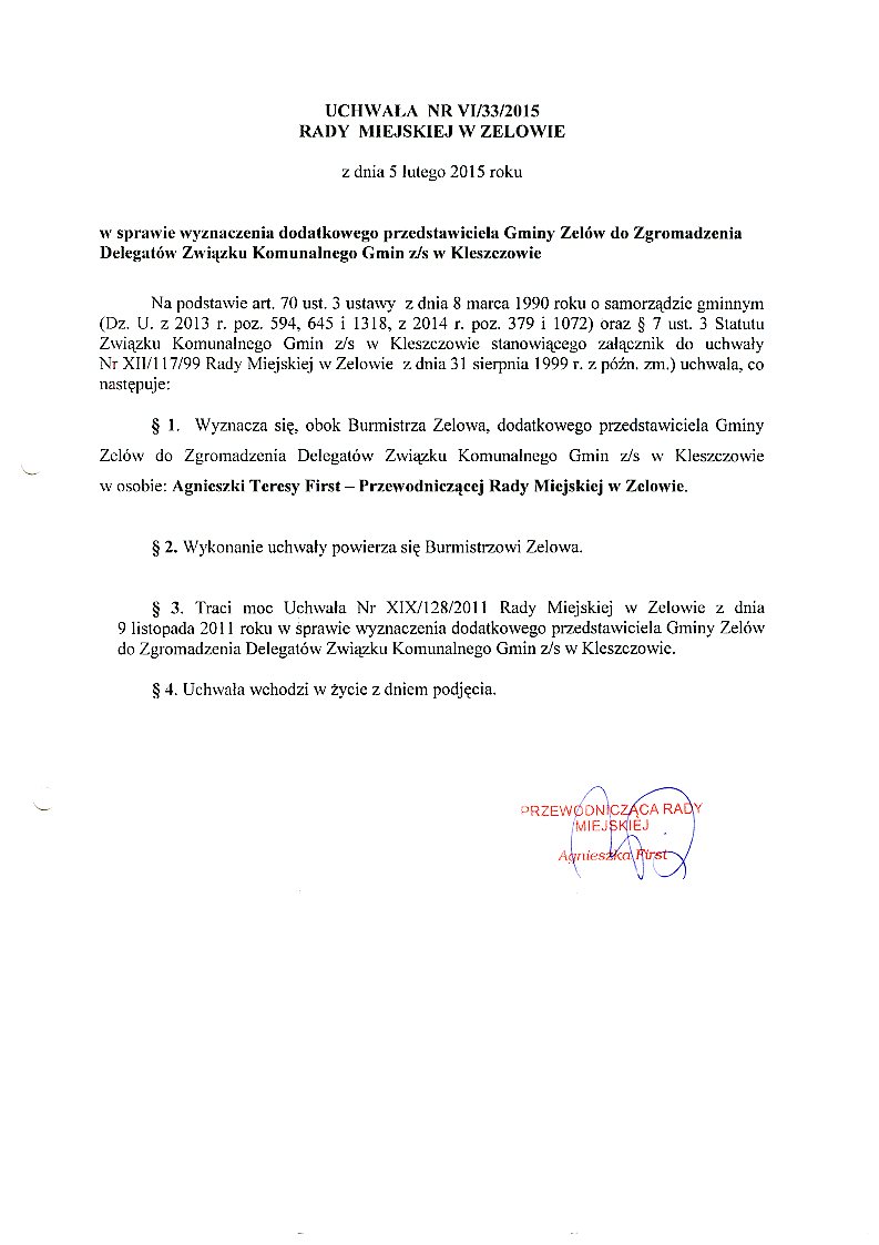 | Tytuł aktu prawnego - skrócony: | w sprawie wyznaczenia dodatkowego przedstawiciela Gminy Zelów do Zgromadzenia Delegatów Związku Komunalnego Gmin z/s w Kleszczowie. |