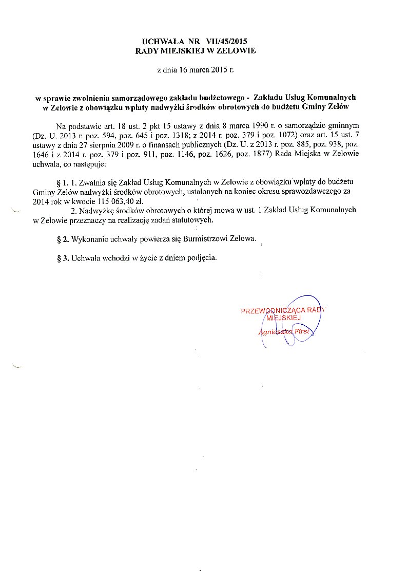 | Tytuł aktu prawnego - skrócony: | w sprawie zwolnienia samorządowego zakładu budżetowego - Zakłądu Usług Komunalnych w Zelowie z obowiązku wpłaty nadwyżki środków obrotowych do budżetu Gminy Zelów |