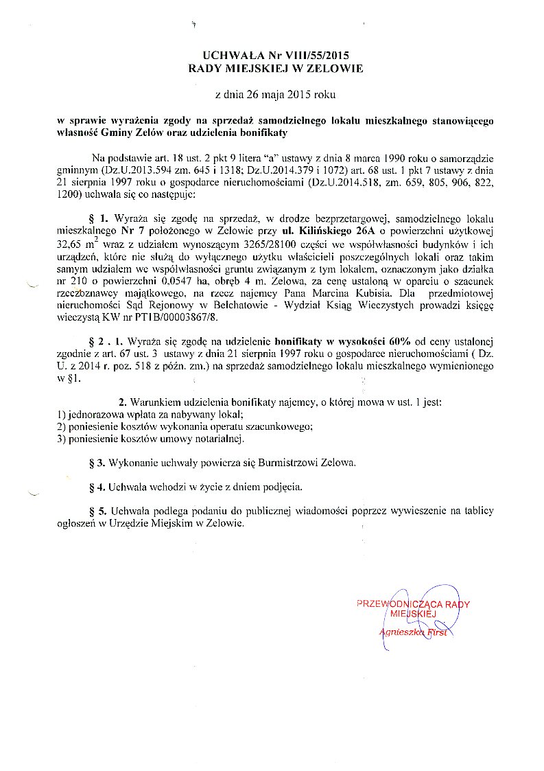 | Tytuł aktu prawnego - skrócony: | w sprawie wyrażenia zgody na sprzedaż samodzilnego lokalu mieszkalnego stanowiącego własnośc Gminy Zelów oraz udzielenia bonifikaty |