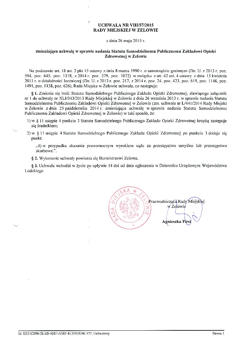| Tytuł aktu prawnego - skrócony: | zmieniająca uchwalę w sprawie nadania Statutu Samodzielnego Publicznego Zakładu Opieki Zdrowotnej w Zelowie |
