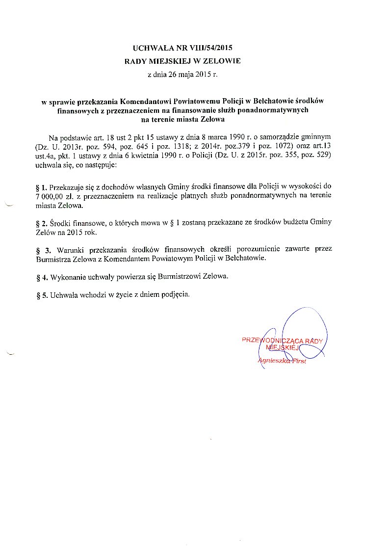 | Tytuł aktu prawnego - skrócony: | w sprawie przekazania Komendantowi Powiatowemu Policji w Bełchatowie środków finansowych z przeznaczeniem na finansowanie służb ponadnormatywnych na terenie Gminy Zelów. |