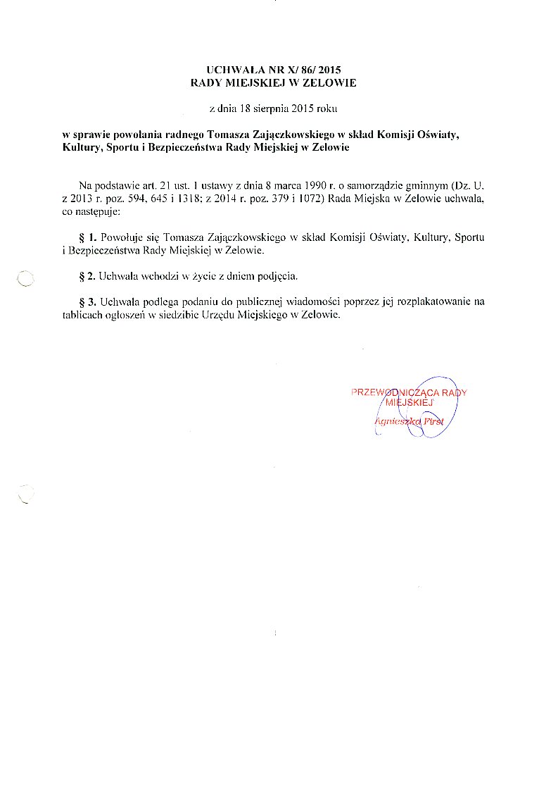 | Tytuł aktu prawnego - skrócony: | w sprawie powołania radnego Tomasza Zajączkowskiego w skład Komisji Oświaty, Kultury, Sportu i Bezpieczeństwa Rady Miejskiej w Zelowie |