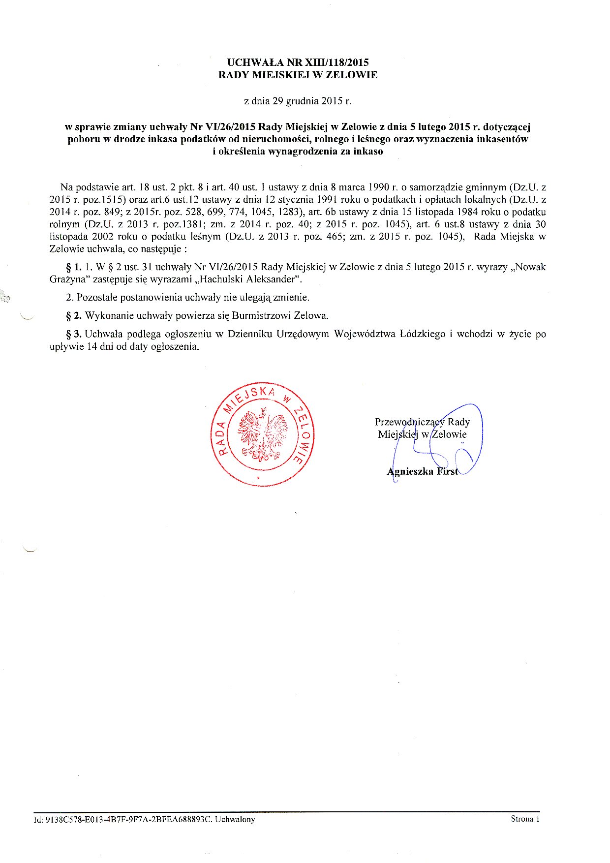 | Tytuł aktu prawnego - skrócony: | zmiany uchwały Nr VI/26/2015 Rady Miejskiej w Zelowie z dnia 5 lutego 2015 roku dotyczącej poboru w drodze inkasa podatków od nieruchomości, rolnego i leśnego oraz wyznaczenia inkasentów i określenia wynagrodzenia za inkaso |