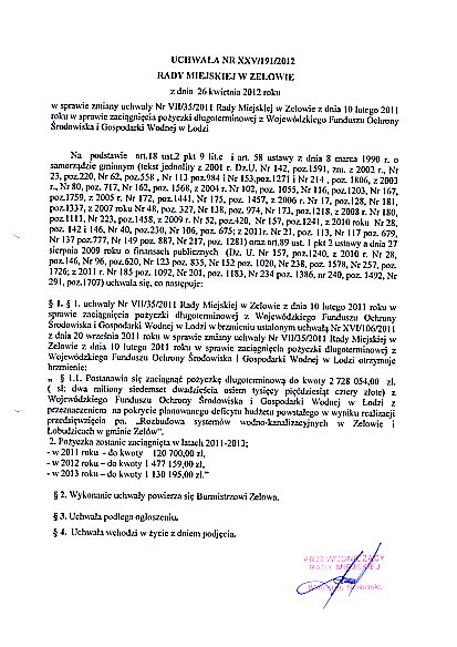 | Tytuł aktu prawnego - skrócony: | w sprawie zmiany uchwały Nr VII/35/2011 Rady Miejskiej w Zelowie z dnia 10 lutego 2011 roku w sprawie zaciągnięcia pożyczki długoterminowej z Wojewódzkiego Funduszu Ochrony Środowiska i Gospodarki Wodnej w Łodzi. |