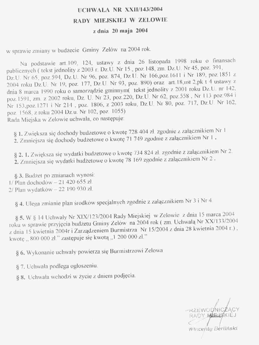 | Tytuł aktu prawnego - skrócony: | Uchwała Rady Miejskiej w Zelowie w sprawie zmiany w budżecie Gminy Zelów na 2004 r. |