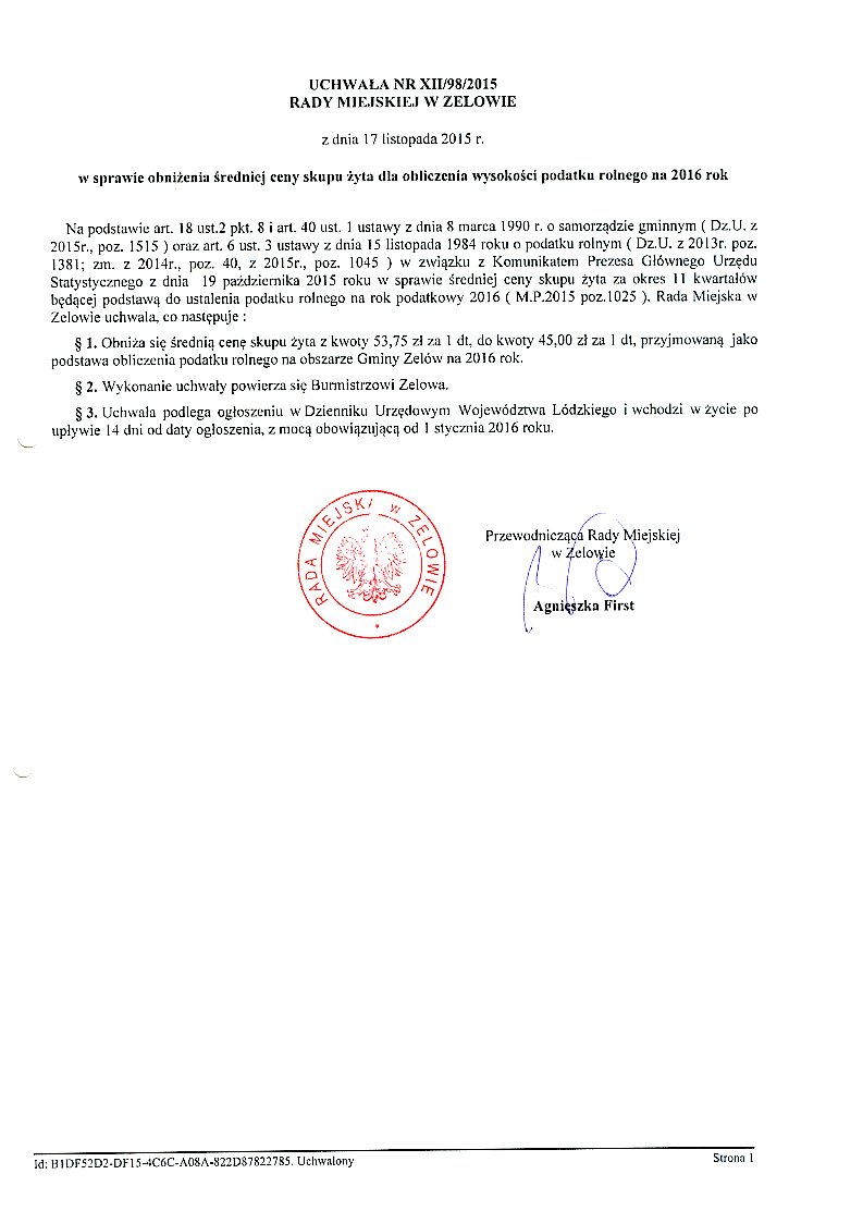 | Tytuł aktu prawnego - skrócony: | w sprawie obniżenia średniej ceny skupu żyta dla obliczenia wysokości podatku rolnego na 2016 rok |