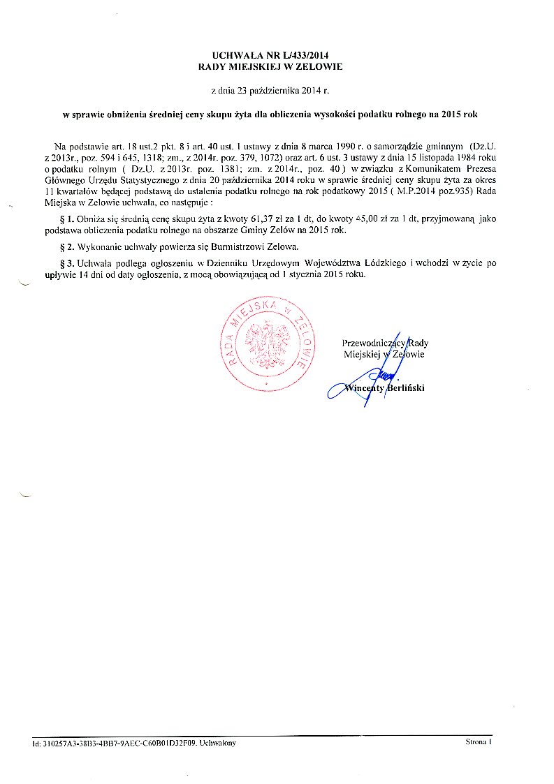 Uchwała nr L/433/2014 w sprawie obniżenia średniej ceny skupu żyta dla obliczenia wysokości podatku rolnego na 2015 rok