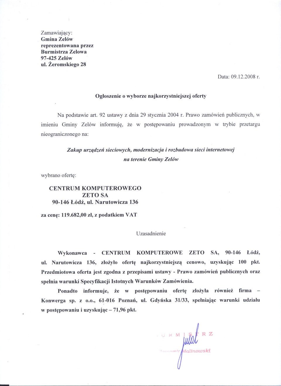 | Przedmiotem zamówienia jest dostawa sprzętu i oprogramowania oraz modernizacja gminnej bezprzewodowej sieci dostępowej do Internetu. Modernizacja obejmuje: - wymianę sprzętu służącego do realizacji mostu bezprzewodowego pomiędzy wieżą Kościoła w Zelowie a Urzędem Miejskim w Zelowie pracującego w paśmie 2,4 GHz na urządzenia pracujące w paśmie 5 GHz. - wymianę sprzętu obsługującego stacje klienckie zainstalowanego na wieży Kościoła w Zelowie (2 szt. punktów dostępowych wraz z antenami kierunkowymi, praca w paśmie 2,4 GHz). - instalację urządzeń oraz uruchomienie dodatkowego mostu bezprzewodowego w paśmie 5 GHz pomiędzy wieżą Kościoła w Zelowie a Gimnazjum we wsi Łobudzice (odległość w linii prostej: 4 km). - instalację oraz uruchomienie 2 szt. punktów dostępowych z antenami kierunkowymi (praca w paśmie 2,4 GHz) obsługujących stacje klienckie we wsi Łobudzice. - instalację oraz uruchomienie 2 szt. punktów dostępowych z antenami dookólnymi (praca w paśmie 2,4 GHz) obsługujących stacje klienckie w Urządzie Miejskim w Zelowie. - instalację oraz uruchomienie przełączników sieciowych w Urzędzie Miejskim w Zelowie (przełącznik szkieletowy), na wieży Kościoła w Zelowie oraz na Gimnazjum we wsi Łobudzice. - instalację w przełączniku szkieletowym oraz uruchomienie dedykowanego kontrolera sieci bezprzewodowej służącego do zarządzania punktami dostępowymi obsługującymi stacje klienckie. - instalację i konfigurację oprogramowania zarządzającego dla uruchamianej infrastruktury sieciowej (na serwerze udostępnionym przez Zamawiającego). - wykonanie dokumentacji powykonawczej oraz eksploatacyjnej. Instalacja urządzeń sieci bezprzewodowej obejmuje instalację niezbędnych masztów oraz okablowania. Oferowany sprzęt jak i oprogramowanie (za wyjątkiem mostów bezprzewodowych i anten) muszą pochodzić od jednego producenta. Obecnie działająca sieć internetowa Gminy Zelów funkcjonuje w całości na urządzeniach, którego producentem jest CISCO Systems w związku z czym sprzęt użyty do modernizacji i rozbudowy sieci intePrzedmiotem zamówienia jest dostawa sprzętu i oprogramowania oraz modernizacja gminnej bezprzewodowej sieci dostępowej do Internetu. Modernizacja obejmuje: - wymianę sprzętu służącego do realizacji mostu bezprzewodowego pomiędzy wieżą Kościoła w Zelowie a Urzędem Miejskim w Zelowie pracującego w paśmie 2,4 GHz na urządzenia pracujące w paśmie 5 GHz. - wymianę sprzętu obsługującego stacje klienckie zainstalowanego na wieży Kościoła w Zelowie (2 szt. punktów dostępowych wraz z antenami kierunkowymi, praca w paśmie 2,4 GHz). - instalację urządzeń oraz uruchomienie dodatkowego mostu bezprzewodowego w paśmie 5 GHz pomiędzy wieżą Kościoła w Zelowie a Gimnazjum we wsi Łobudzice (odległość w linii prostej: 4 km). - instalację oraz uruchomienie 2 szt. punktów dostępowych z antenami kierunkowymi (praca w paśmie 2,4 GHz) obsługujących stacje klienckie we wsi Łobudzice. - instalację oraz uruchomienie 2 szt. punktów dostępowych z antenami dookólnymi (praca w paśmie 2,4 GHz) obsługujących stacje klienckie w Urządzie Miejskim w Zelowie. - instalację oraz uruchomienie przełączników sieciowych w Urzędzie Miejskim w Zelowie (przełącznik szkieletowy), na wieży Kościoła w Zelowie oraz na Gimnazjum we wsi Łobudzice. - instalację w przełączniku szkieletowym oraz uruchomienie dedykowanego kontrolera sieci bezprzewodowej służącego do zarządzania punktami dostępowymi obsługującymi stacje klienckie. - instalację i konfigurację oprogramowania zarządzającego dla uruchamianej infrastruktury sieciowej (na serwerze udostępnionym przez Zamawiającego). - wykonanie dokumentacji powykonawczej oraz eksploatacyjnej. Instalacja urządzeń sieci bezprzewodowej obejmuje instalację niezbędnych masztów oraz okablowania. Oferowany sprzęt jak i oprogramowanie (za wyjątkiem mostów bezprzewodowych i anten) muszą pochodzić od jednego producenta. Obecnie działająca sieć internetowa Gminy Zelów funkcjonuje w całości na urządzeniach, którego producentem jest CISCO Systems w związku z czym sprzęt użyty do modernizacji i rozbudowy sieci intePrzedmiotem zamówienia jest dostawa sprzętu i oprogramowania oraz modernizacja gminnej bezprzewodowej sieci dostępowej do Internetu. Modernizacja obejmuje: - wymianę sprzętu służącego do realizacji mostu bezprzewodowego pomiędzy wieżą Kościoła w Zelowie a Urzędem Miejskim w Zelowie pracującego w paśmie 2,4 GHz na urządzenia pracujące w paśmie 5 GHz. - wymianę sprzętu obsługującego stacje klienckie zainstalowanego na wieży Kościoła w Zelowie (2 szt. punktów dostępowych wraz z antenami kierunkowymi, praca w paśmie 2,4 GHz). - instalację urządzeń oraz uruchomienie dodatkowego mostu bezprzewodowego w paśmie 5 GHz pomiędzy wieżą Kościoła w Zelowie a Gimnazjum we wsi Łobudzice (odległość w linii prostej: 4 km). - instalację oraz uruchomienie 2 szt. punktów dostępowych z antenami kierunkowymi (praca w paśmie 2,4 GHz) obsługujących stacje klienckie we wsi Łobudzice. - instalację oraz uruchomienie 2 szt. punktów dostępowych z antenami dookólnymi (praca w paśmie 2,4 GHz) obsługujących stacje klienckie w Urządzie Miejskim w Zelowie. - instalację oraz uruchomienie przełączników sieciowych w Urzędzie Miejskim w Zelowie (przełącznik szkieletowy), na wieży Kościoła w Zelowie oraz na Gimnazjum we wsi Łobudzice. - instalację w przełączniku szkieletowym oraz uruchomienie dedykowanego kontrolera sieci bezprzewodowej służącego do zarządzania punktami dostępowymi obsługującymi stacje klienckie. - instalację i konfigurację oprogramowania zarządzającego dla uruchamianej infrastruktury sieciowej (na serwerze udostępnionym przez Zamawiającego). - wykonanie dokumentacji powykonawczej oraz eksploatacyjnej. Instalacja urządzeń sieci bezprzewodowej obejmuje