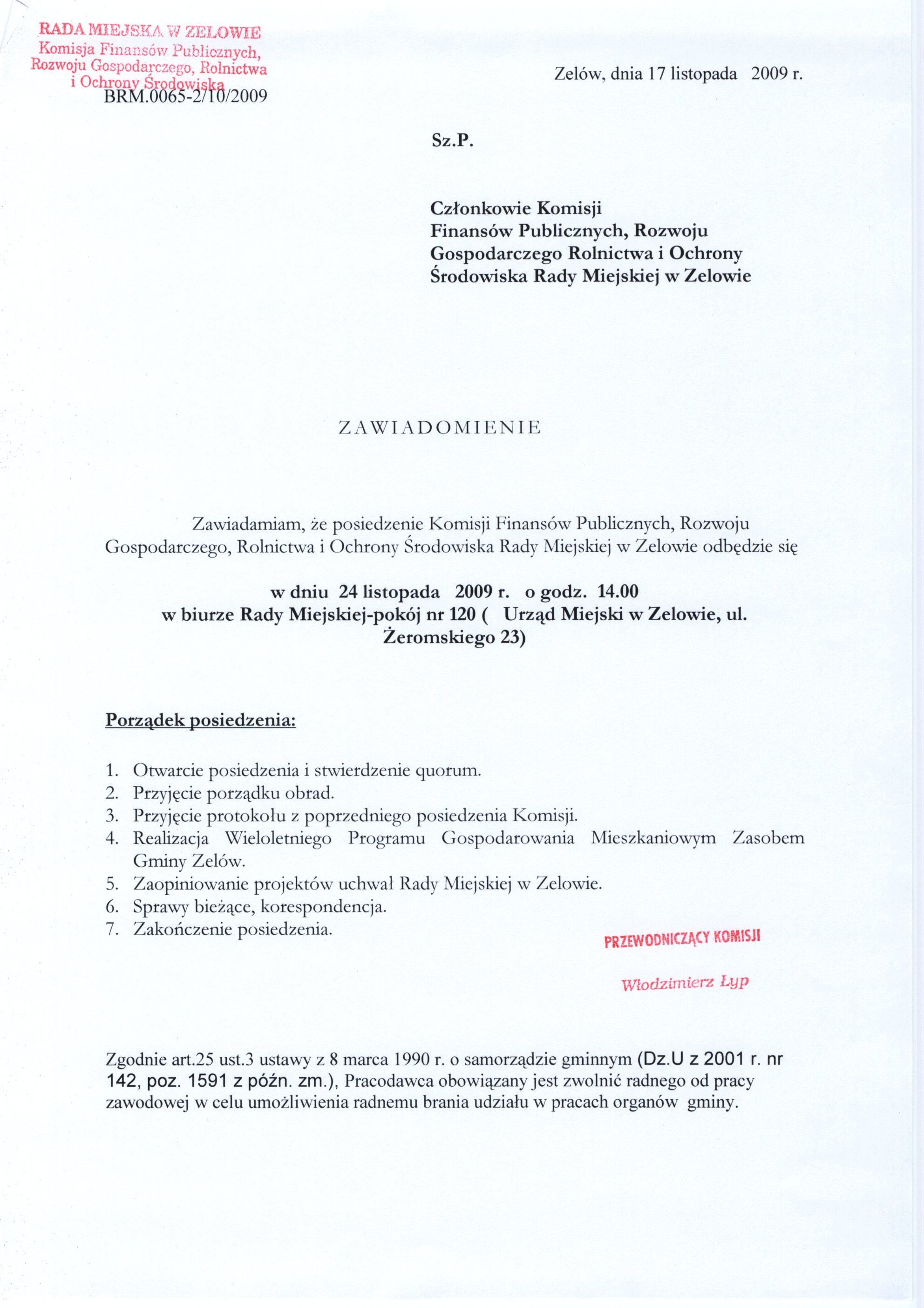 Zawiadomienie o posiedzeniu Komisji Finansów Publicznych, Rozwoju Gospodarczego, Rolnictwa i Ochrony Środowiska Rady Miejskiej w Zelowie