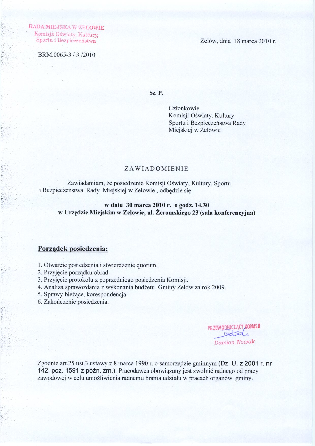 Zawiadomienie o posiedzeniu Komisji Oświaty, Kultury, Sportu i Bezpieczeństwa Rady Miejskiej w Zelowie