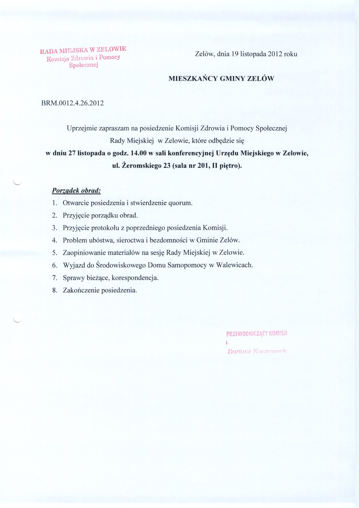 | Adresat: | Zawiadomienie o posiedzeniu Komisji Oświaty, Kultury, Sportu i Bezpieczeństwa Rady Miejskiej w Zelowie |