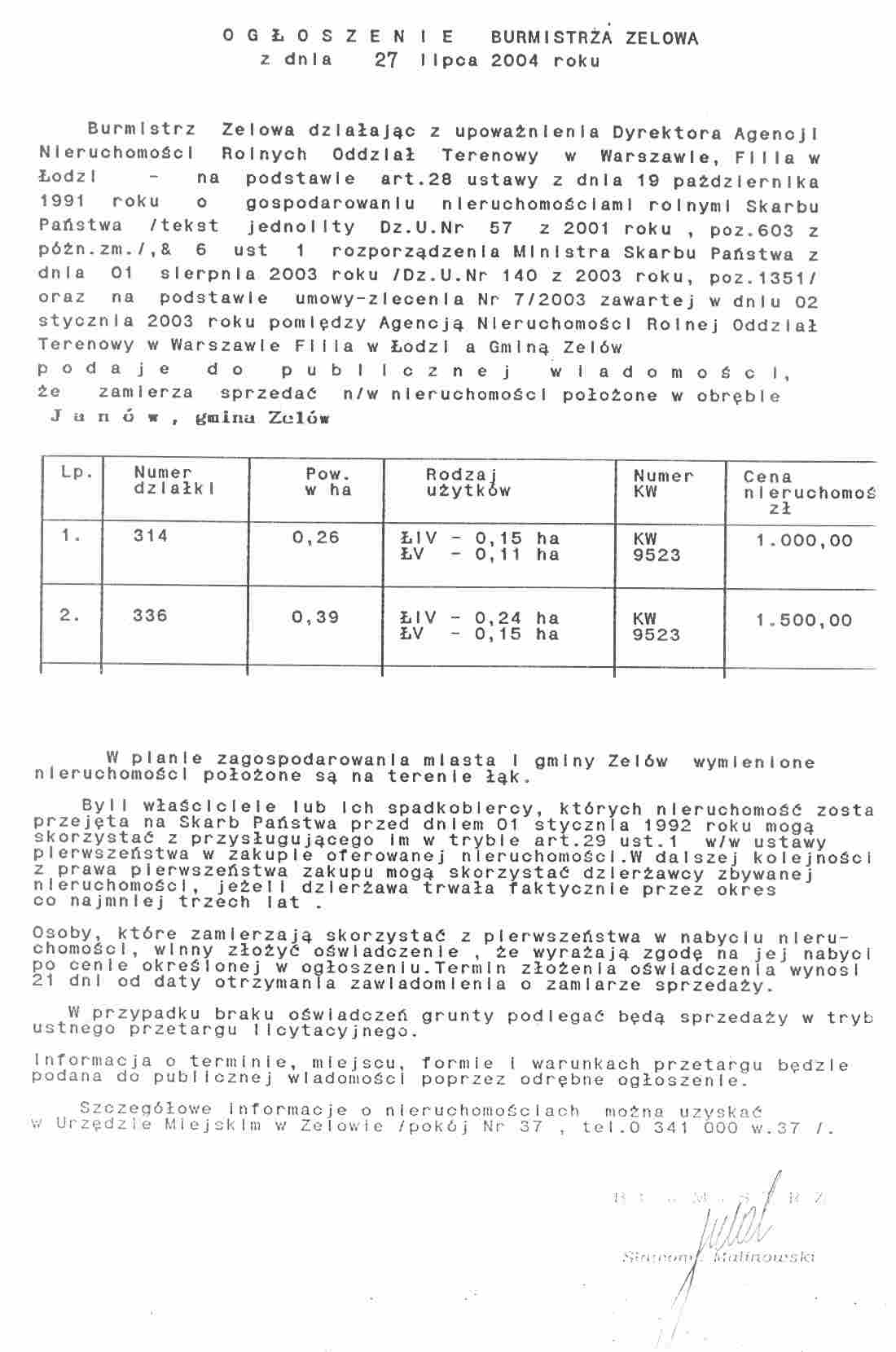 Ogłoszenie Burmistrza Zelowa w sprawie sprzedaży nieruchomości (obręb Janów)