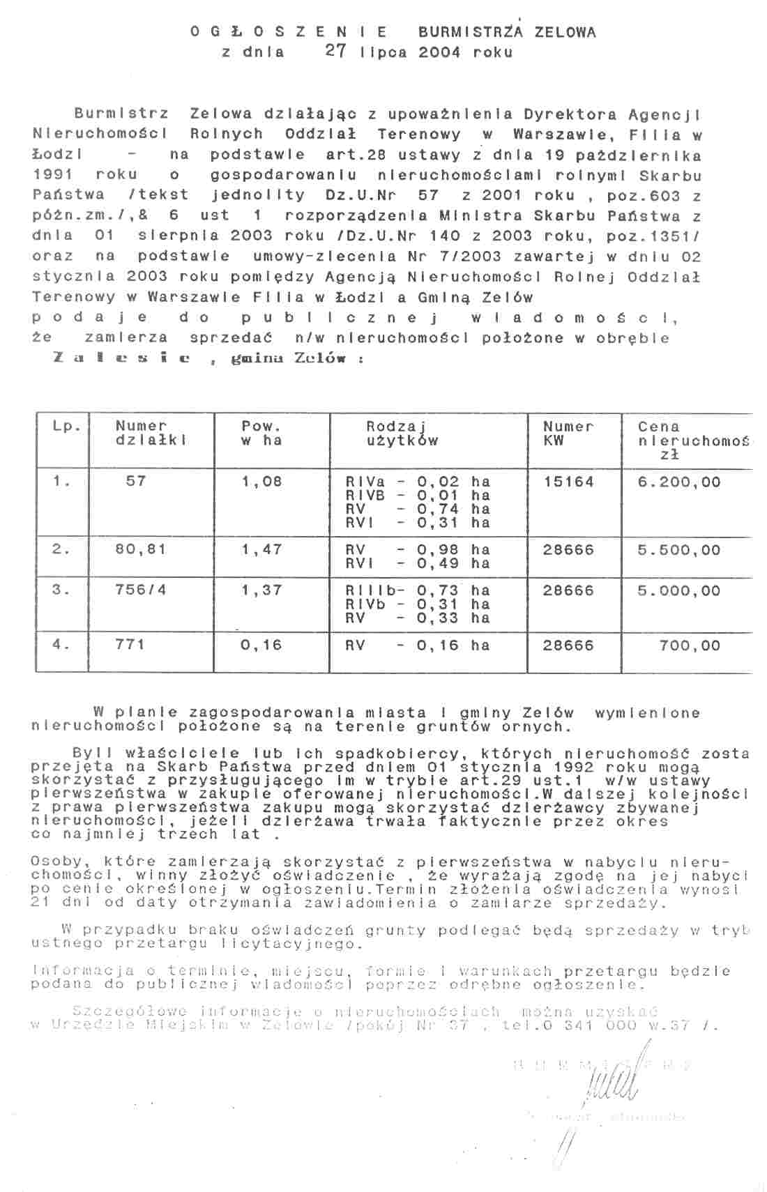 Ogłoszenie Burmistrza Zelowa w sprawie sprzedaży nieruchomości (obręb Zalesie)