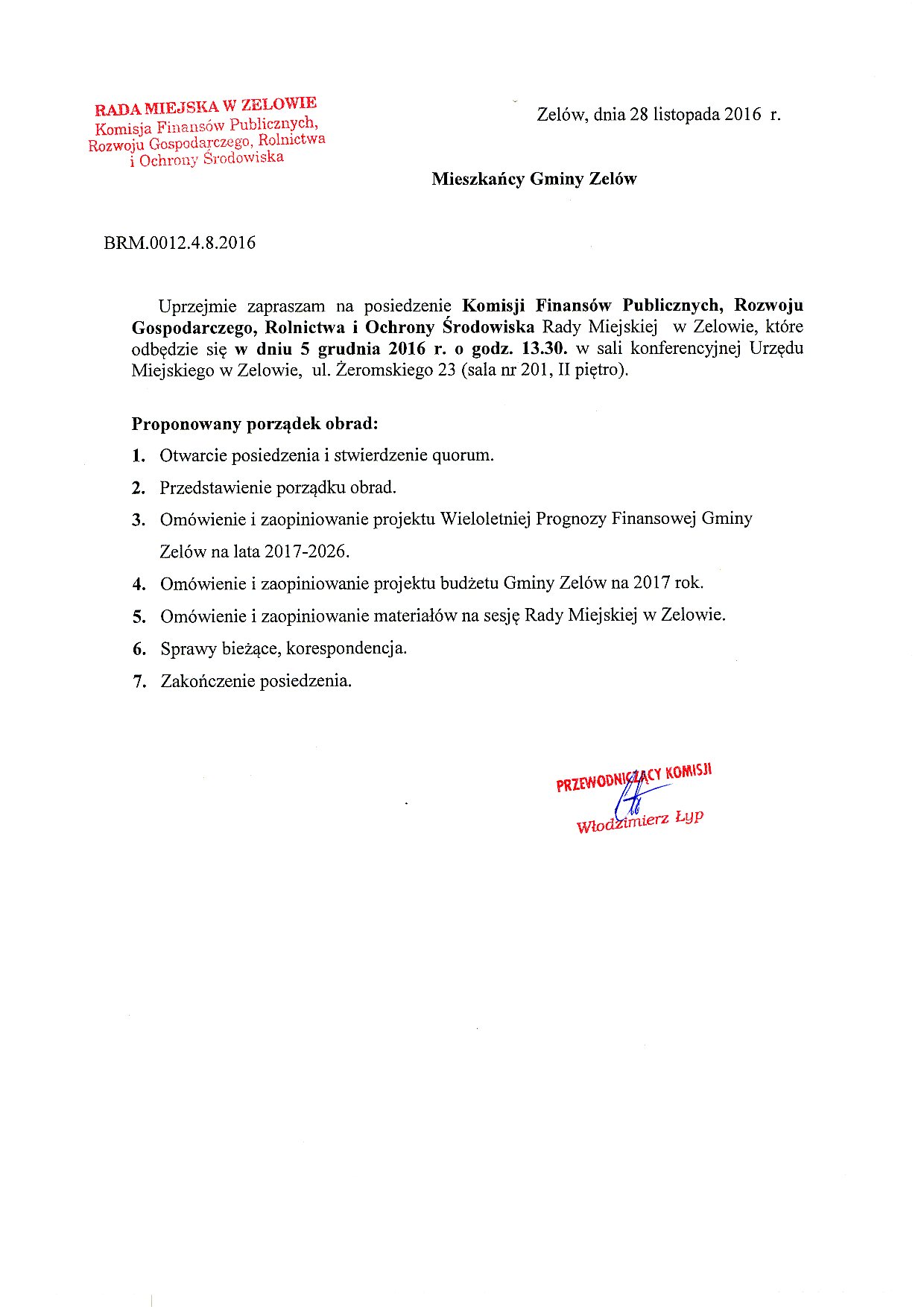 Zawiadomienie o posiedzeniu Komisji Finansów Publicznych, Rozwoju Gospodarczego, Rolnictwa i Ochrony Środowiska Rady Miejskiej w Zelowie