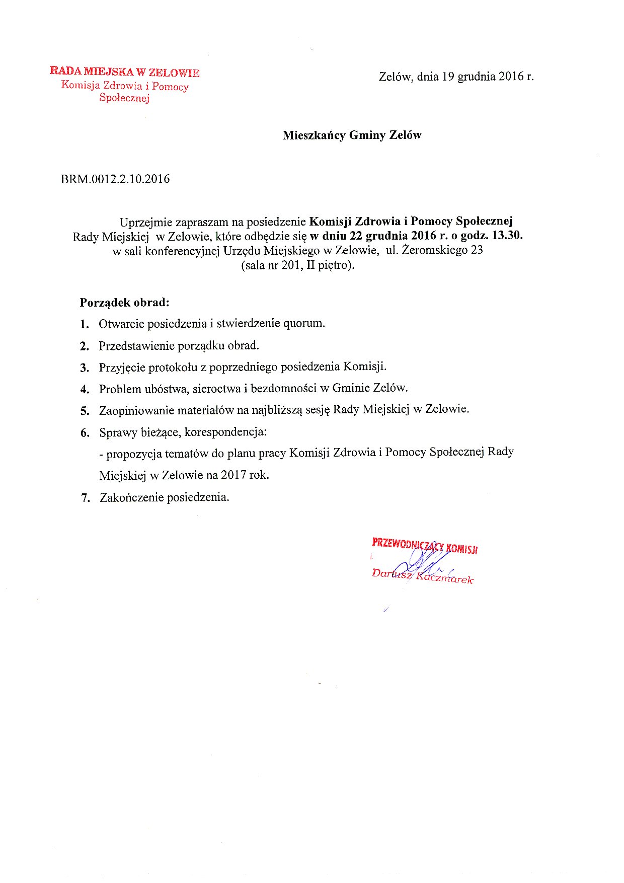 Zawiadomienie o posiedzeniu Komisji Zdrowia i Pomocy Społecznej w Zelowie