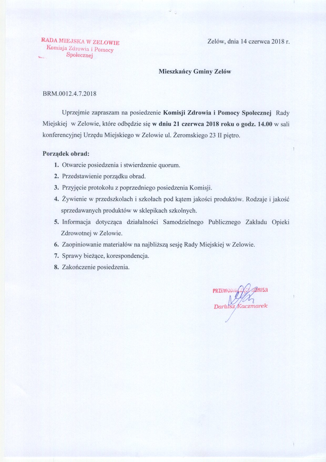 Zaproszenie na posiedzenie Komisji Zdrowia i Pomocy Społecznej Rady Miejskiej w Zelowie zwołanej na dzień 21 czerwca 2018 roku