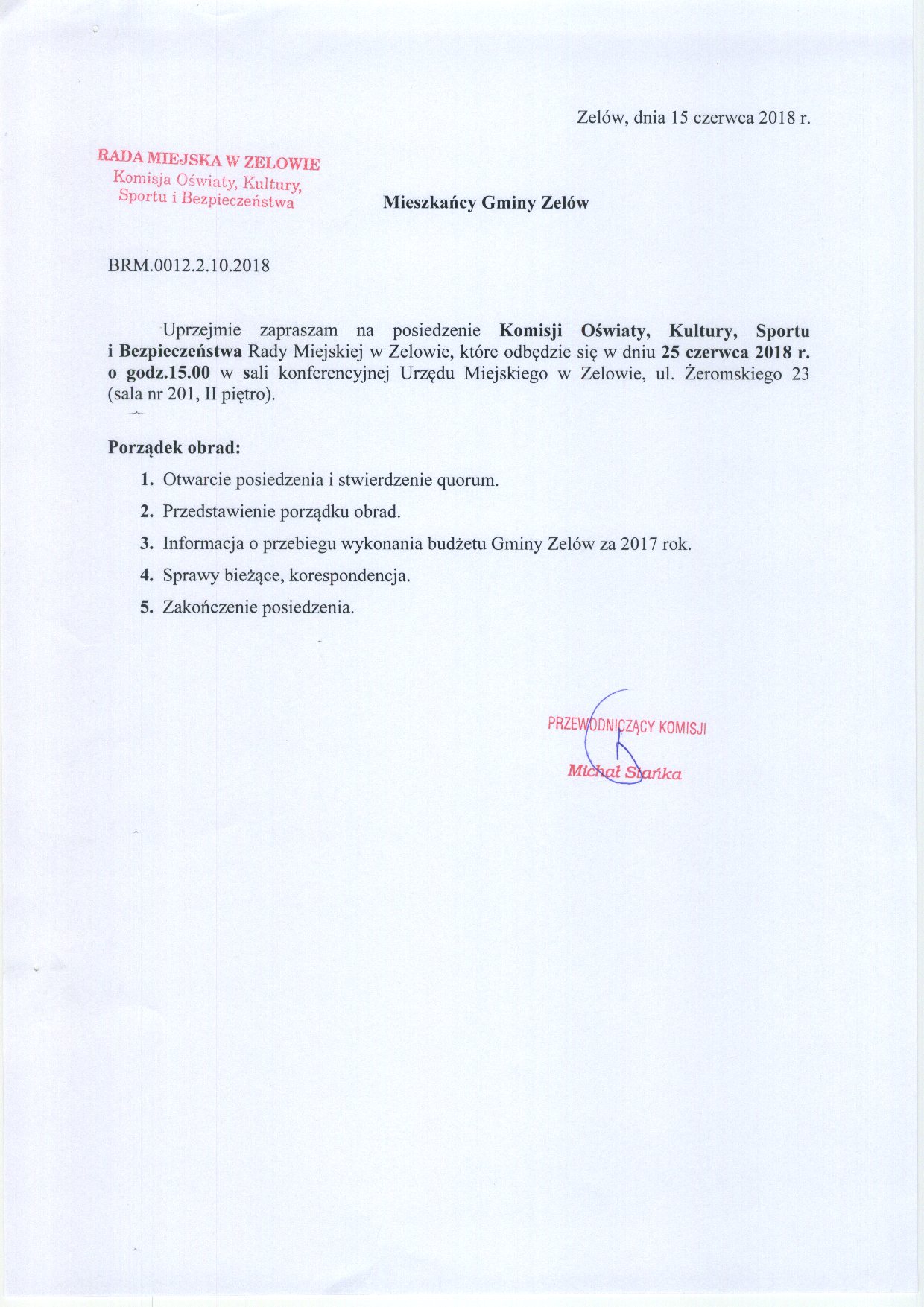 Zaproszenie na posiedzenie Komisji Oświaty, Kultury, Sportu i Bezpieczeństwa Rady Miejskiej w Zelowie