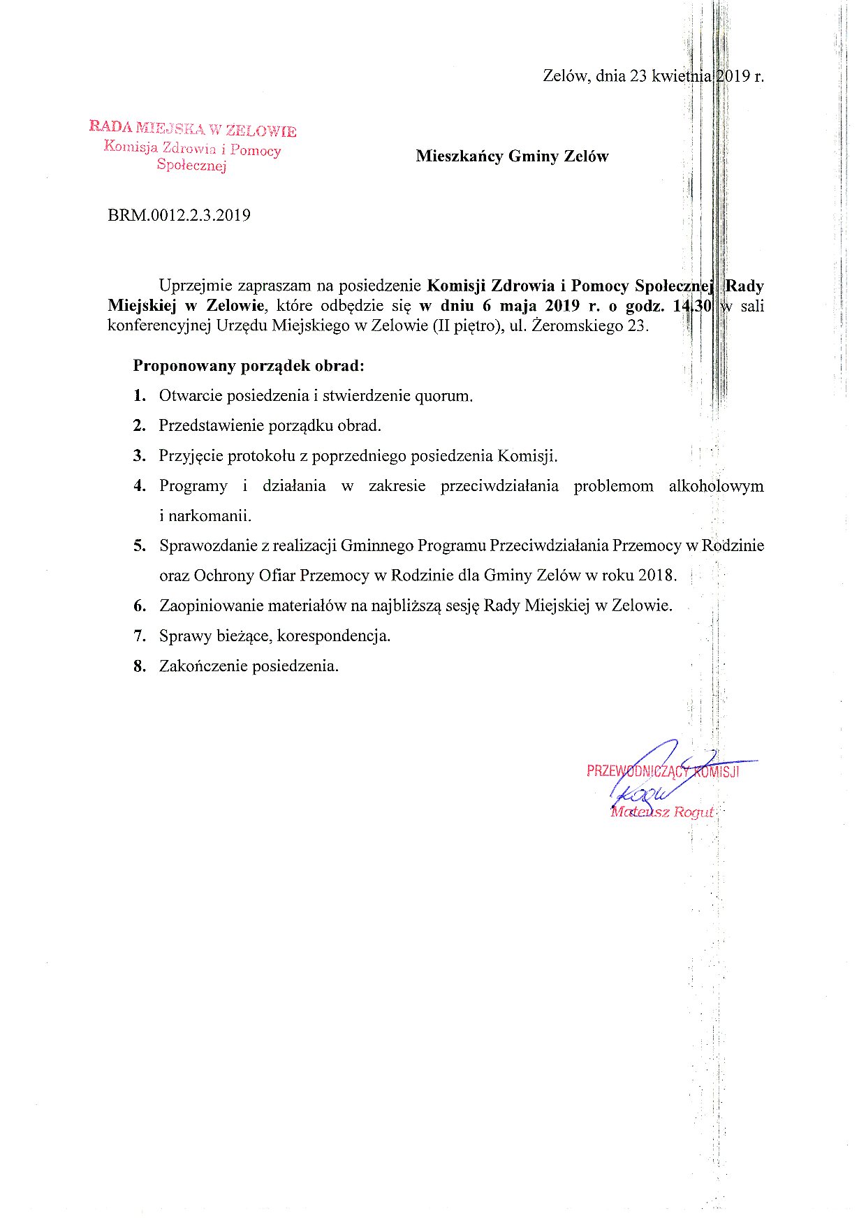 Zaproszenie na posiedzenie Komisji Zdrowia i Pomocy Społecznej Rady Miejskiej w Zelowie zwolanej na 6 maja 2019 r.