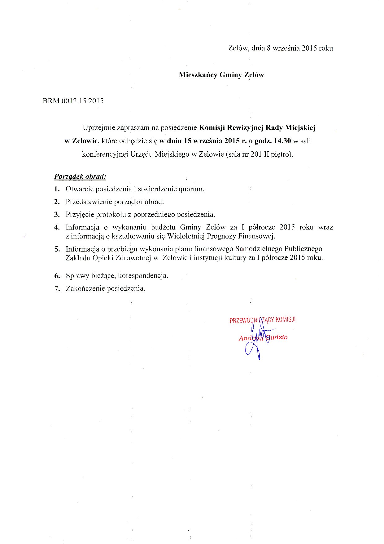 Zawiadomienie o posiedzeniu Komisji Rewizyjnej Rady Miejskiej w Zelowie